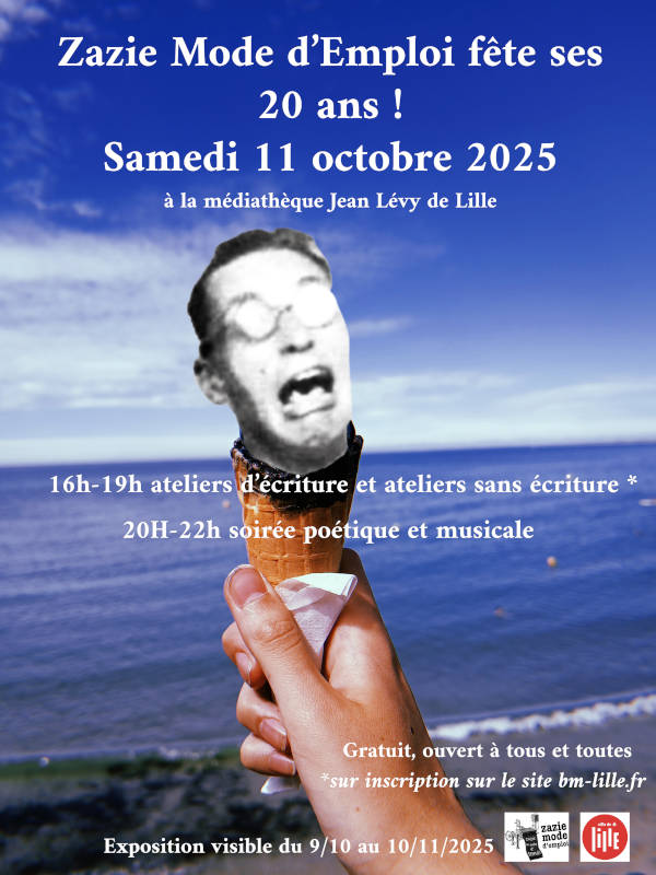 20h / GRANDE SOIRÉE POÉSIQUE par Lætitia Gallego, Ludovic Montet et Martin Granger / Hommage à Ian Monk compagnon de Zazie Mode d’Emploi depuis l’origine / Avatars en chansons : quelques-unes des plus de 4000 réécritures du site Zazipo / Pianecdotes : des interviews d’enfants donnent naissance à des chansonnettes ultra-courtes / Restitution du chœur de lecteurs.
